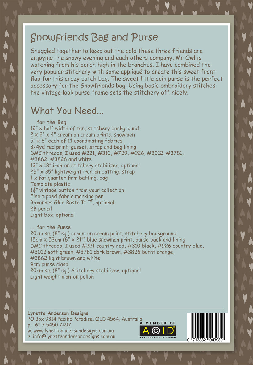 Snuggled together to keep out the cold these three friends are enjoying the snowy evening and each others company, Mr Owl is watching from his perch high in the branches. I have combined the very popular stitchery with some appliqué to create this sweet front flap for this crazy patch bag. The sweet little purse is the perfect accessory for the Snowfriends bag, soft thread colours and the antiqued purse frame sets the stitchery off nicely.