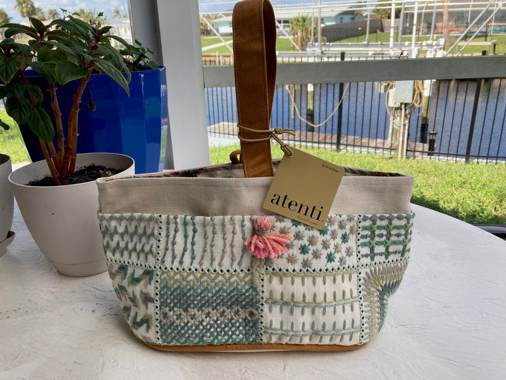 This stand-alone, carry around organizer is perfect to store and keep handy all your tools and notions. It’s fully lined and has four outside and four inside pockets with an ample center well and an ultra-suede handle.