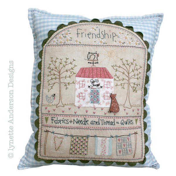 Where do we all go when we need to play amongst fabrics and threads, get inspired, do some retail therapy and enjoy some good company, …where else but our favourite Quilt Shoppe? Combining some simple appliqué with the much loved stitchery Lynette has captured the essence of a good quilt shoppe. The quilt shoppe cat is waiting to greet you on the doorstop and today there is an airing of the quilts outside on the street.