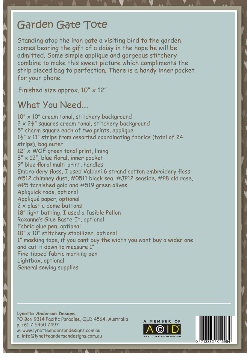 Scrappy strips of fabrics create the background for this sweet garden picture which once stitched has been appliquéd onto the background. Embroidered buttons add interest to the bag handles.