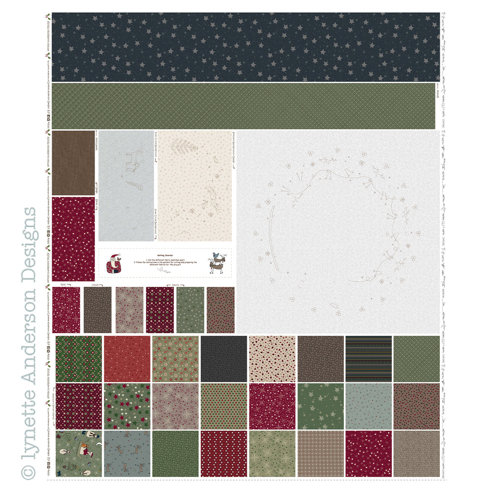 This kit includes:- a colour pattern, fabric prints including pre-printed stitchery background fabric and binding. 1 x hand painted star button.