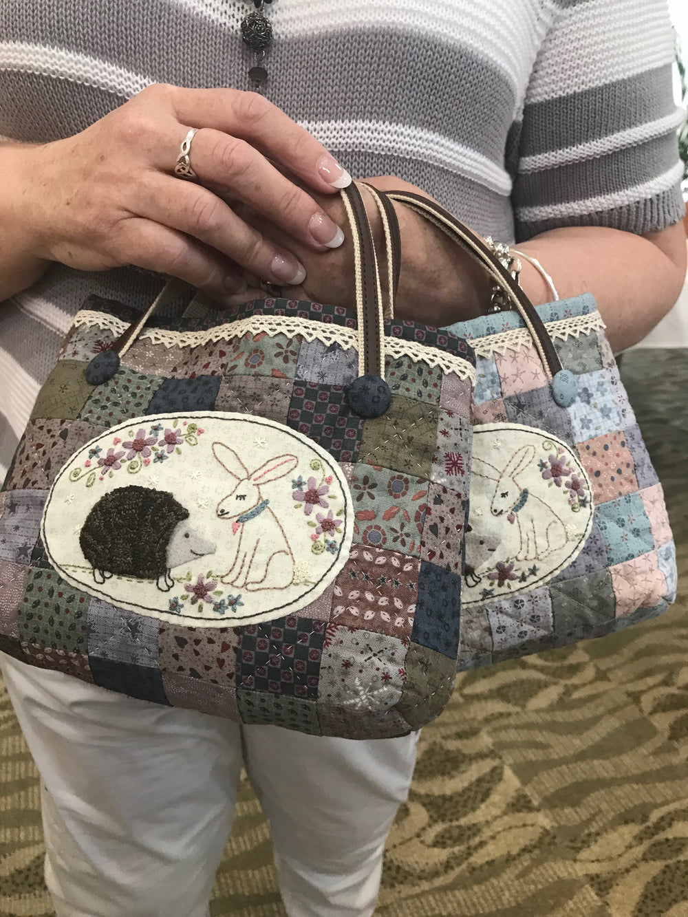 This delightful bag features Howard the hedgehog and his friend Lily the rabbit. Pretty embroidered flowers surround the pair. The spikes on Howard the hedgehog on our sample has been done with punch needle giving him a very effective textured look. The kit includes a piece of dark brown wool to applique his spikes with.