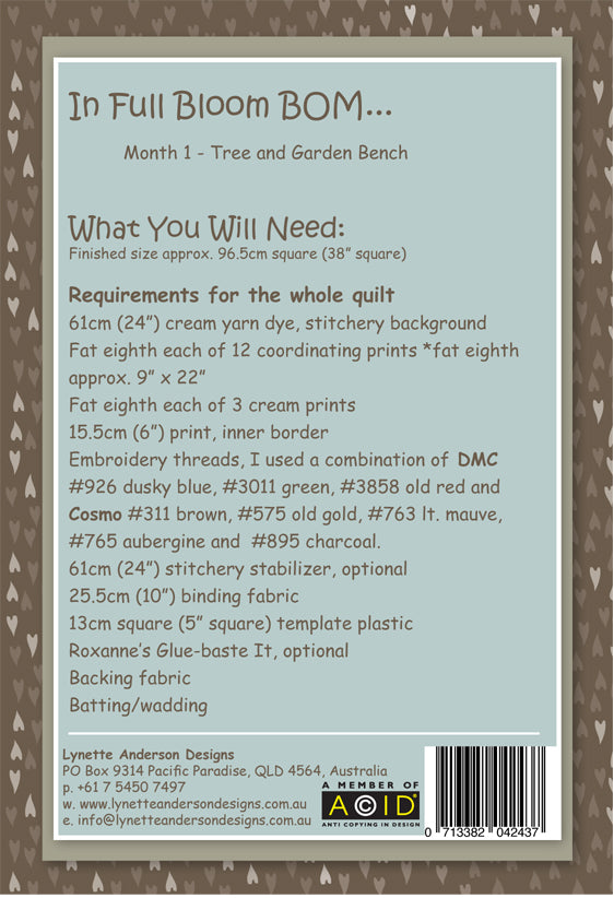 This cute quilt features 12 stitchery designs and Lynette has used her Secret Garden fabrics. This set contains 6 patterns.