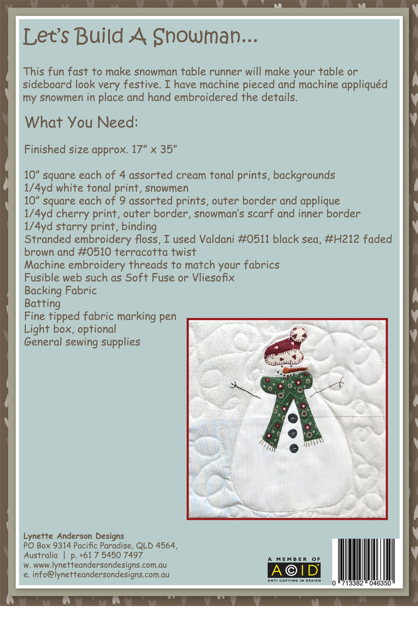 This fun fast to make snowman tablerunner will make your table or sideboard look very festive. I have machine pieced and machine appliquéd my snowmen in place and hand embroidered the details.