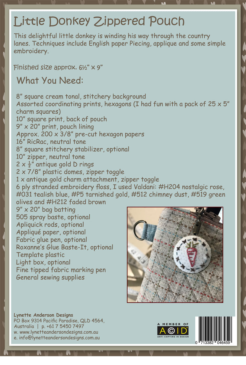 This delightful little donkey is winding his way through the country lanes. Techniques include English paper Piecing, applique and some simple embroidery.