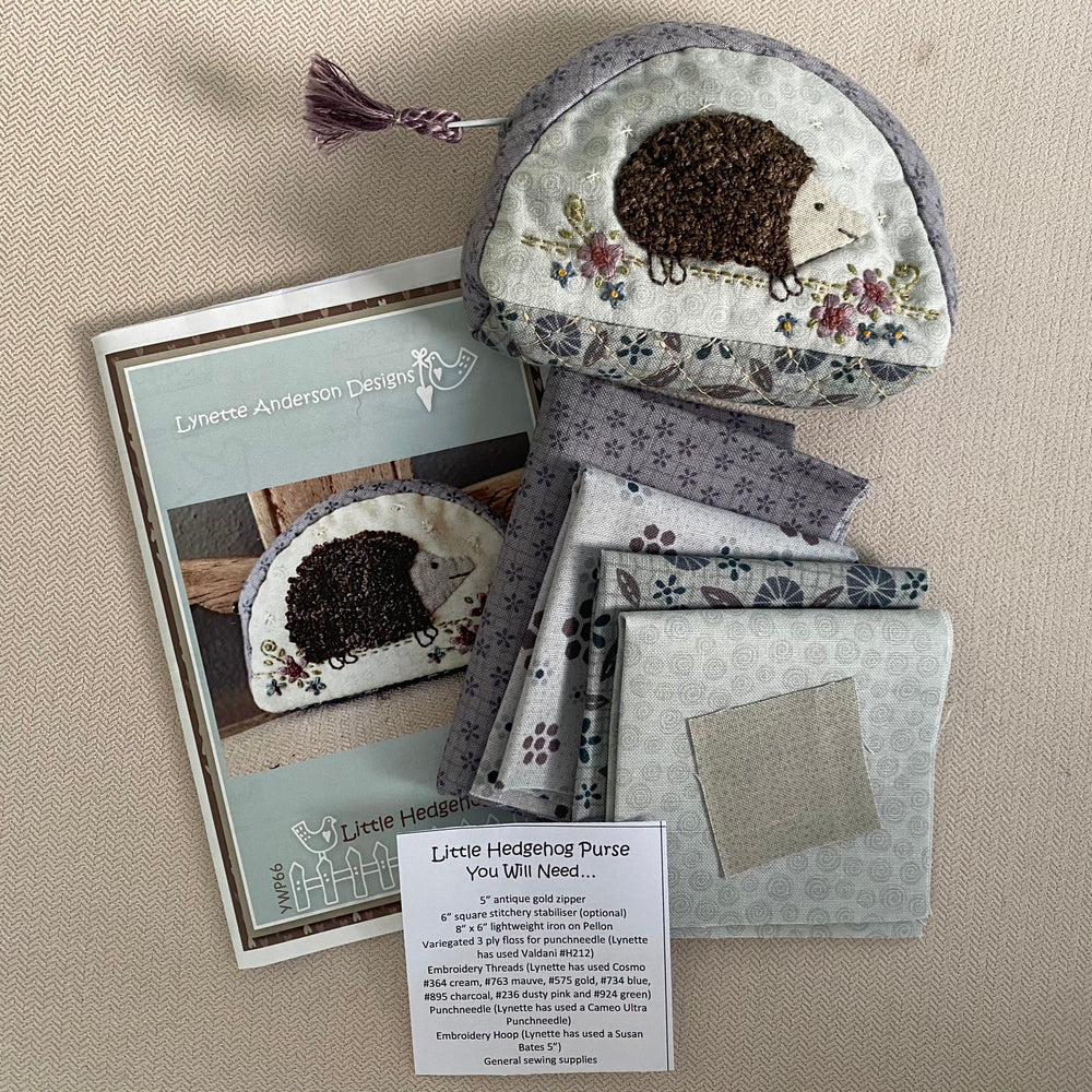 This kit includes the full colour pattern, all the fabrics to make the sweet purse and some woven wool for the hedgehog.