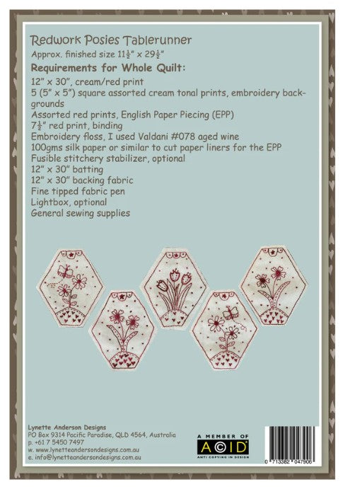These sweet embroidered posies blocks have been stitched using one color of red making Redwork quick, fun, and very addictive! Lynette has combined the redwork embroidered posies with some English Paper Piecing (EPP) to create this pretty runner for my side board at home.