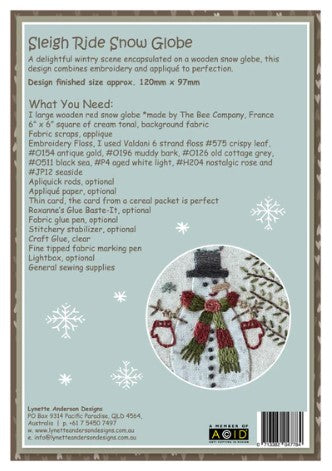A delightful wintry scene encapsulated on a wooden snow globe, this design combines embroidery and appliqué to perfection.