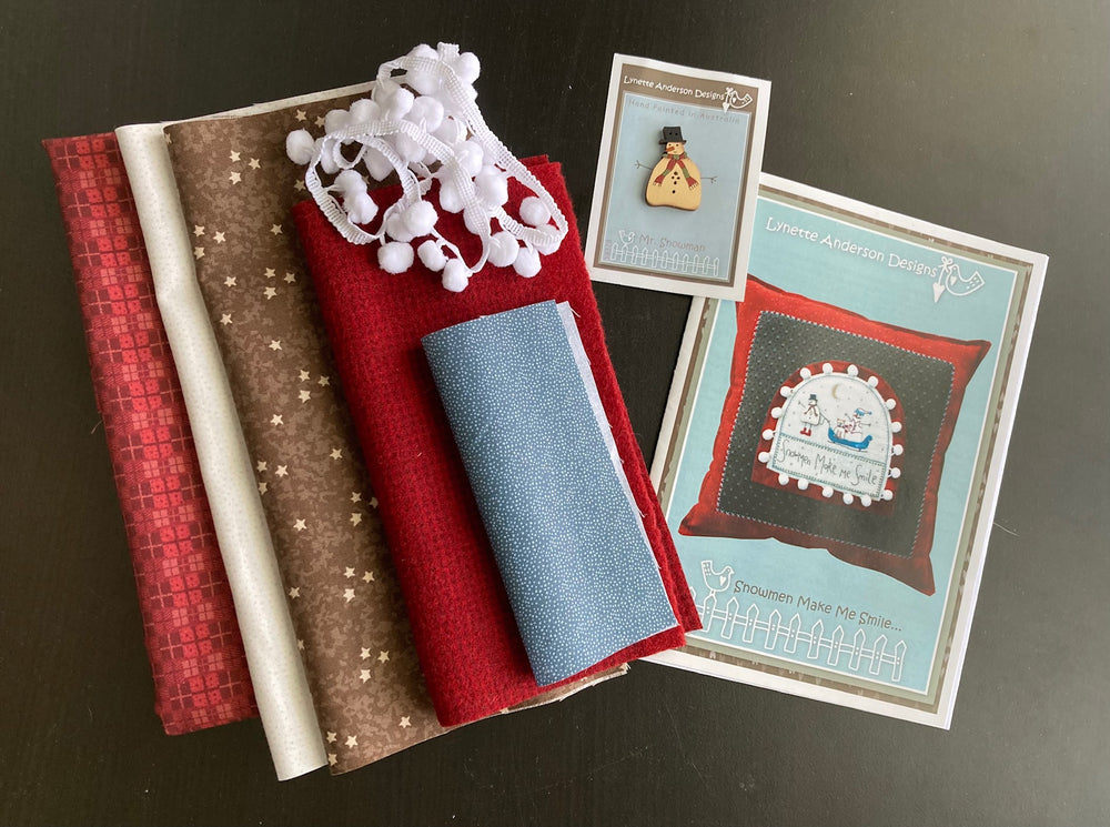 This kit includes all fabrics to make the pillow, hand painted snowman button and white pompoms