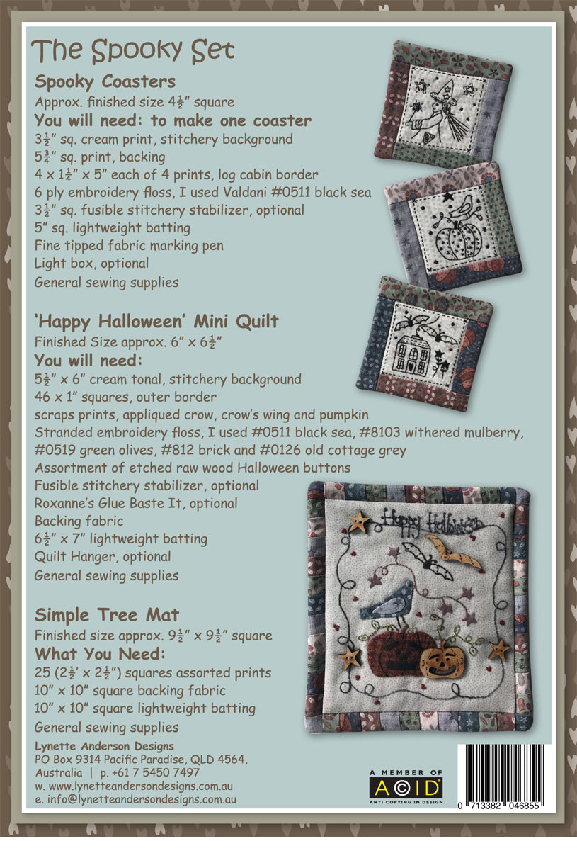 A cute mini quilt which when finished measures just 6" x 6 1/2". Plus 6 gorgeously spooky stitchery designs for you to make into coasters, which will you make first?