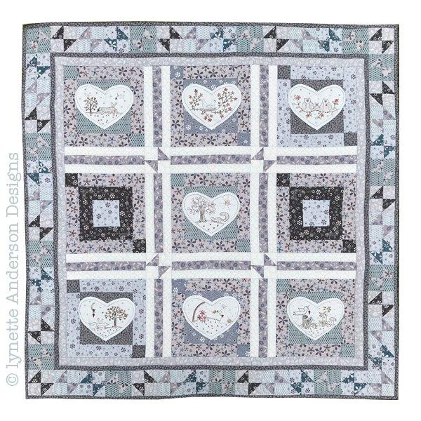 There is a sweet woodland scene in each of the seven stitchery heart blocks. Look for Mr. Bunny, Mr. Fox and the Lonely Crow. The sweet heart blocks are set off by a very simple pieced quilt that measures approx. 42" square when finished.