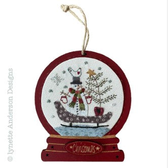 A delightful wintry scene encapsulated on a wooden snow globe, this design combines embroidery and appliqué to perfection.